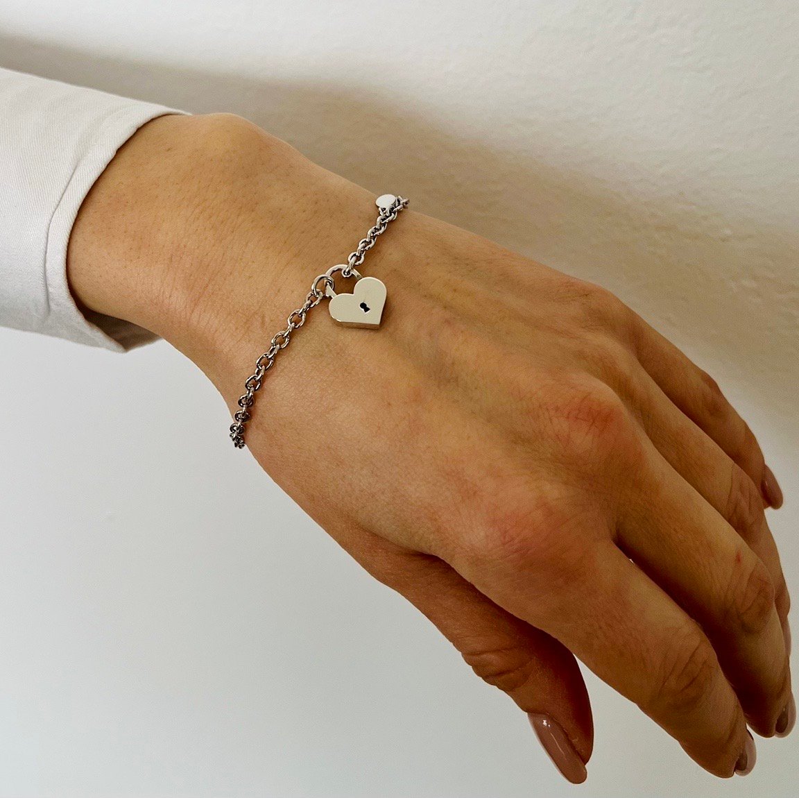 Гладката, полирана повърхност отразява светлината с чист и благороден блясък, подчертавайки качеството на среброто 925 и прецизната изработка. Балансът между силуета на веригата и деликатния символ създава усещане за съвременен лукс и изразителен стил.