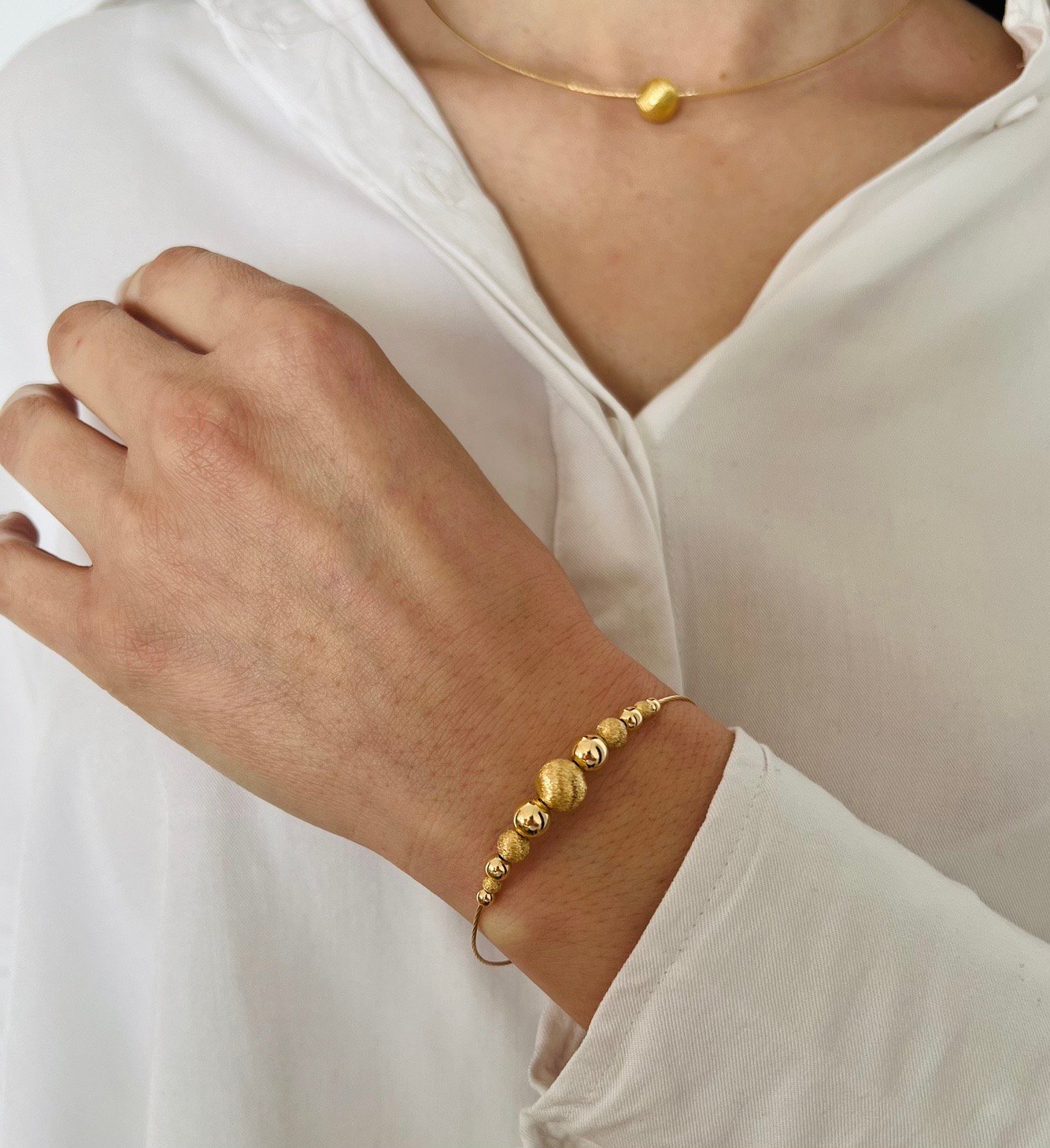 Гривната Golden Sphere Symphony е изискан модел от сребро проба 925 със златисто покритие, съчетаващ различни по размер сферични елементи в хармонична и стилна композиция. Играта между гладките и текстурирани повърхности създава богат визуален ефект и придава усещане за динамика и елегантност.