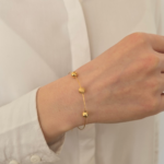 Тънката, деликатна основа подчертава модерната естетика на дизайна, а топлият златист блясък придава меко и благородно сияние върху китката. Прецизната изработка гарантира комфорт при носене и безупречен завършек с усещане за премиум качество.
