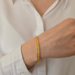 Гривната Golden Sculpted Edge е изискан модел от сребро проба 925 със златисто покритие, съчетаващ артистична текстура и модерна геометрия. Двойната линия с фино релефна повърхност създава усещане за дълбочина и луксозно присъствие, а гладките златисти акценти добавят изчистен и съвременен завършек.
