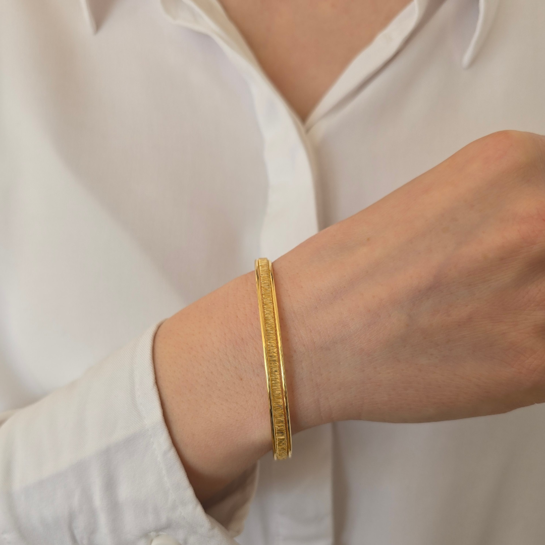 Топлият златист нюанс подчертава богатството на текстурата и придава мек, благороден блясък при всяко движение. Отворената форма осигурява комфорт при носене и подчертава модерния характер на дизайна, съчетавайки стил и премиум качество.