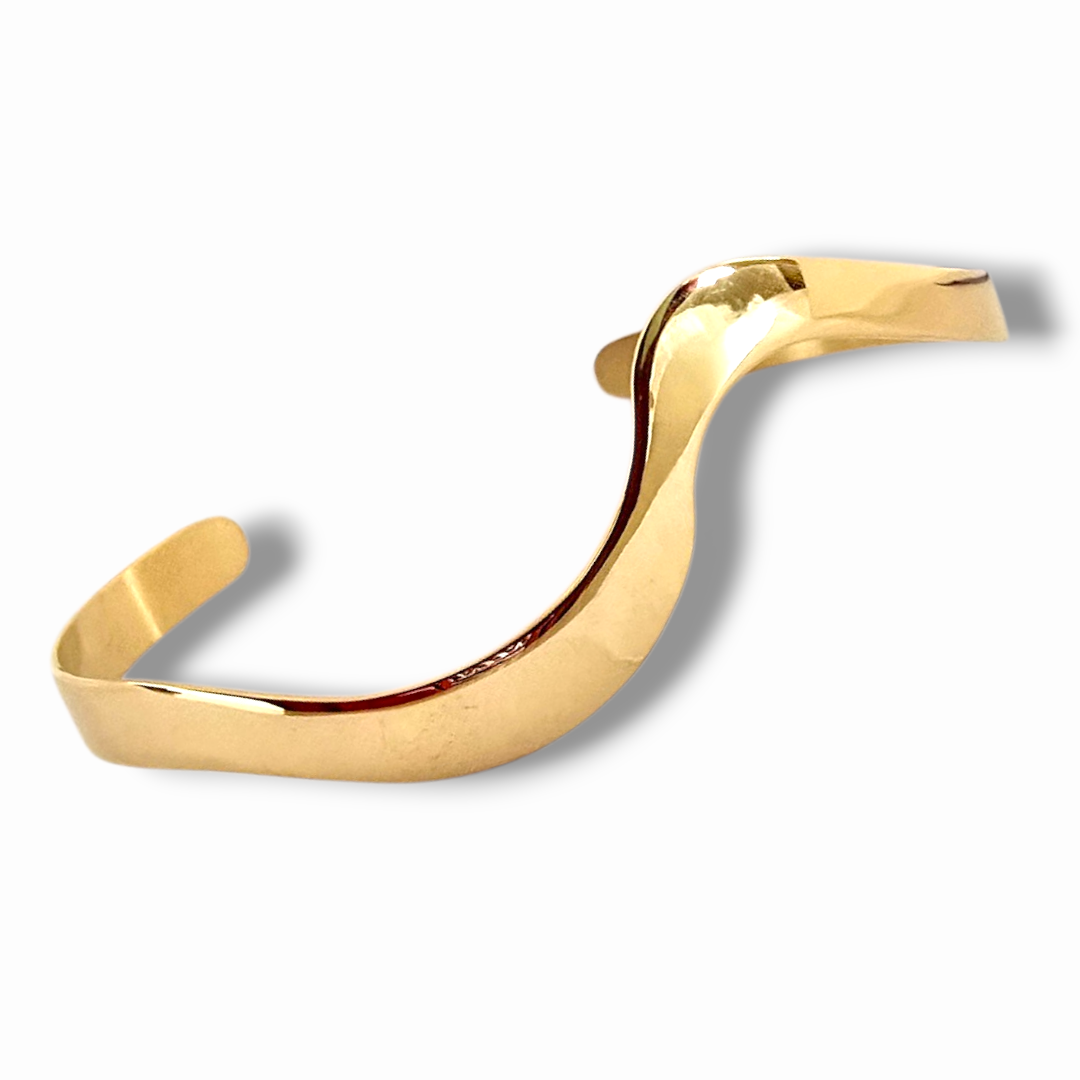 Гладката, огледална повърхност отразява светлината с дълбок, топъл блясък, който подчертава луксозния характер на модела. Отворената форма осигурява комфорт при носене и придава съвременна лекота, съчетавайки минимализъм и силно визуално присъствие.