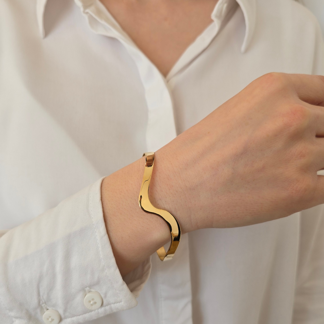 Гривната Golden Fluid Sculpture е впечатляващ модел от сребро проба 925 със златисто покритие, създаден като израз на движение и артистична свобода. Плавната, скулптурна линия създава усещане за динамика и модерна елегантност, превръщайки бижуто в истинско дизайнерско изявление.