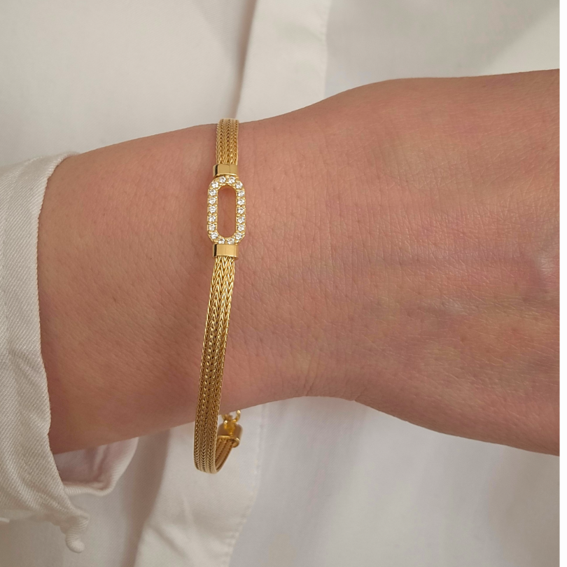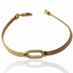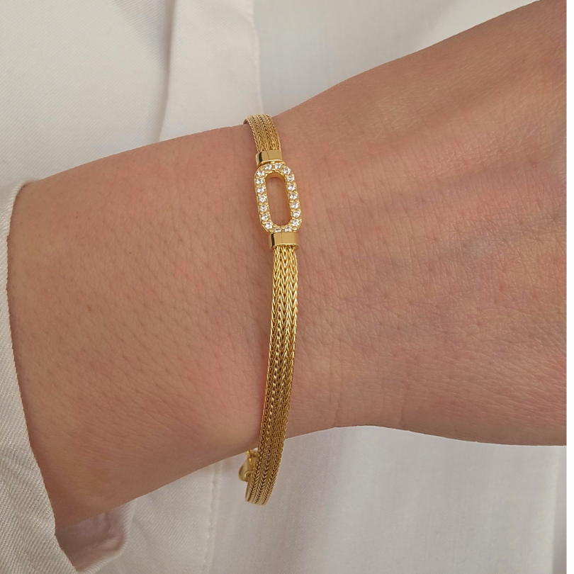 Фината плетена верижка създава усещане за текстура и изтънченост, а топлият златист блясък подчертава благородството на метала. Балансът между изчистената линия и блестящия централен детайл придава на бижуто съвременно и луксозно излъчване.