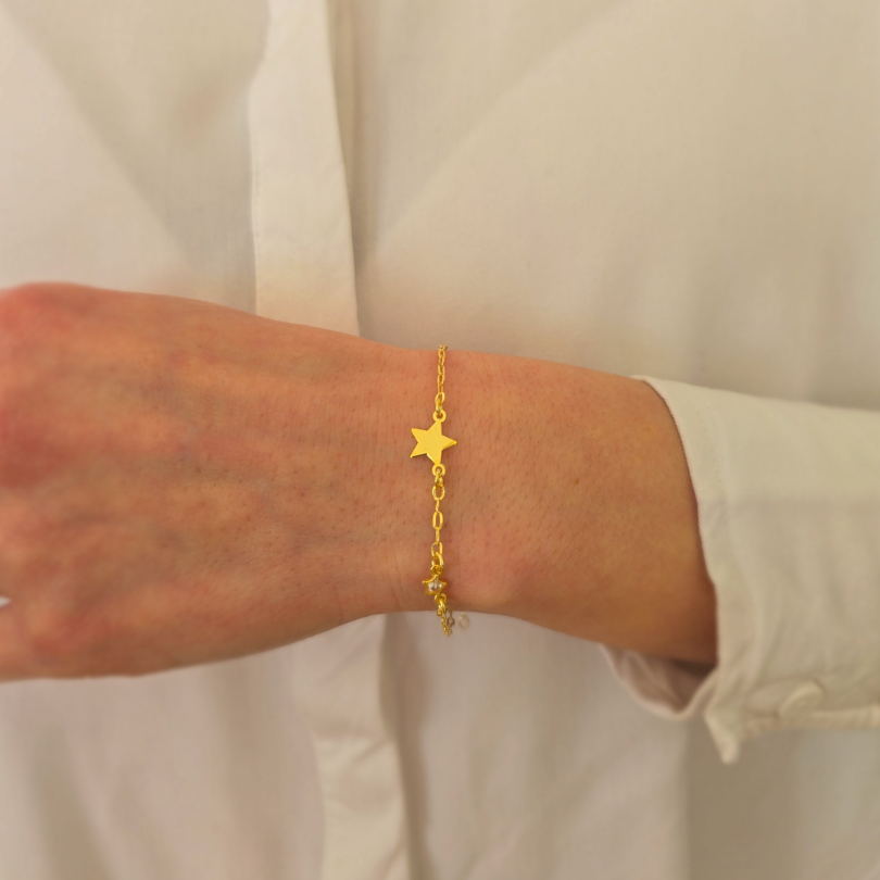 Гривната Golden Star Harmony е изискан модел от сребро проба 925 със златисто покритие, вдъхновен от символиката на звездите – знак за мечти, надежда и вдъхновение. Декоративните елементи във форма на звезди създават нежна и стилна композиция, която придава на бижуто игриво, но елегантно излъчване.