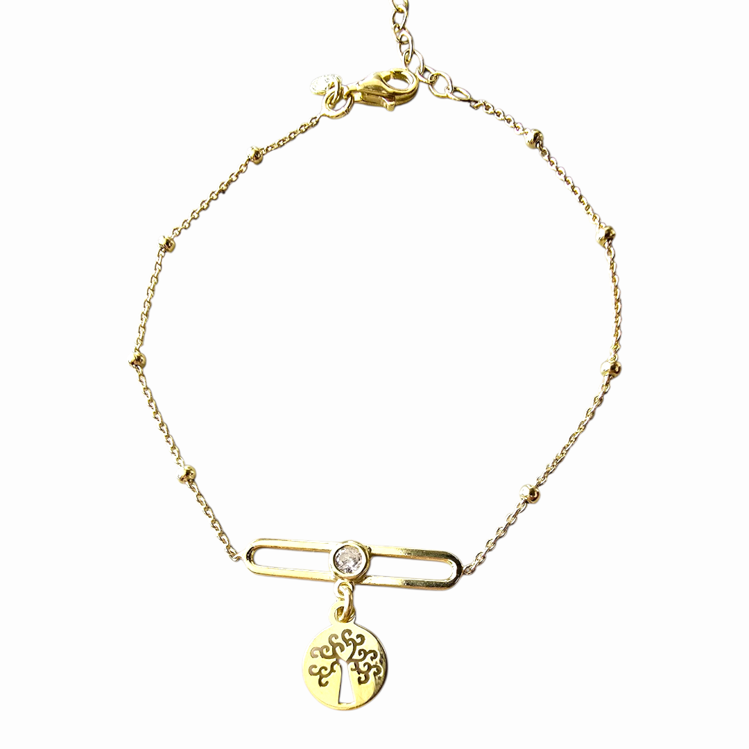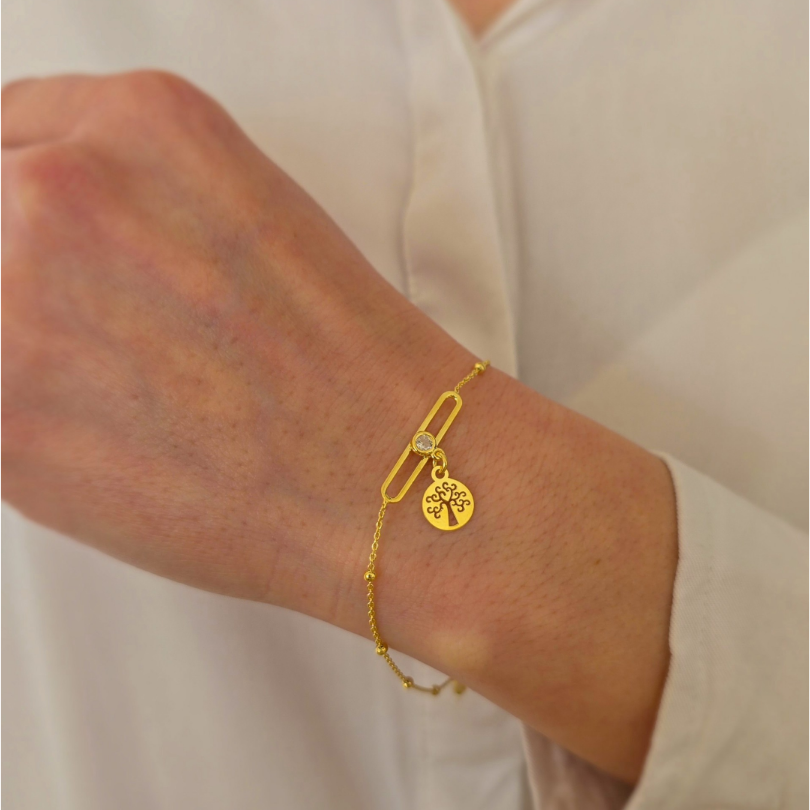 Гривната Golden Tree Charm е изискан модел от сребро проба 925 със златисто покритие, съчетаващ деликатна елегантност и символично послание. Централният елемент с фино инкрустиран камък е допълнен от медальон с Дървото на живота – символ на сила, растеж и хармония.