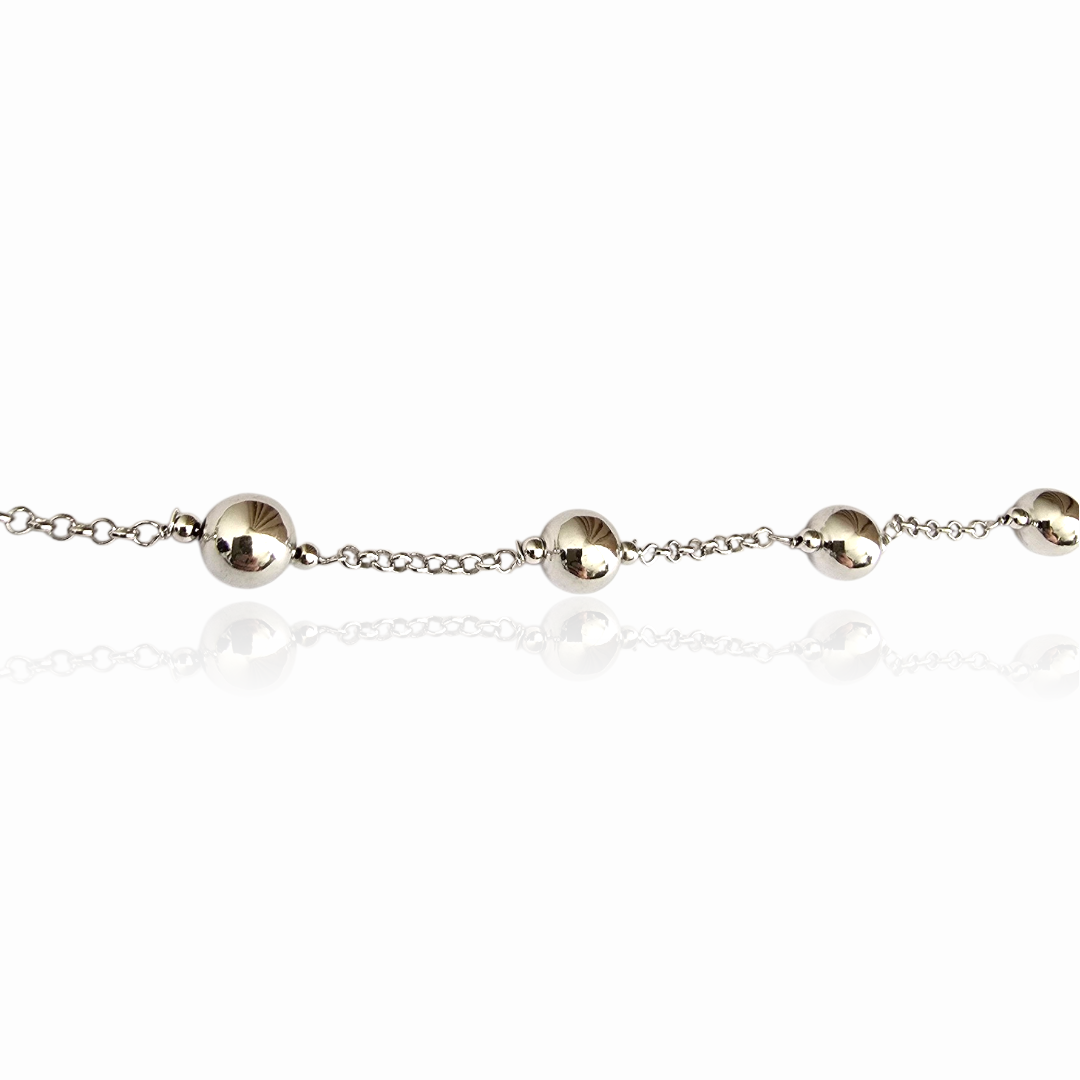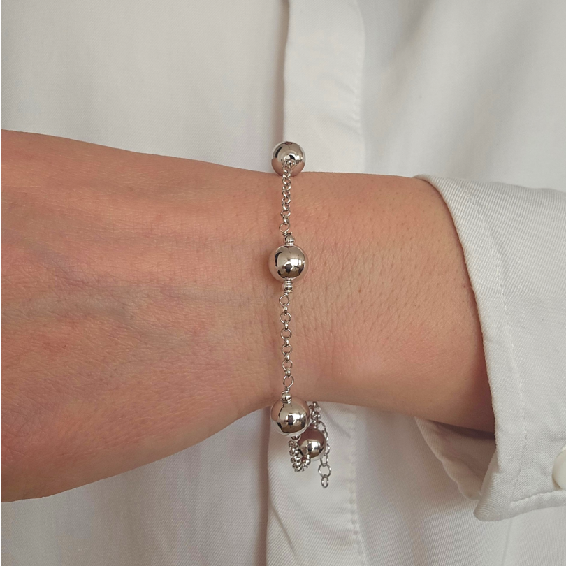 Гладката полирана повърхност на сферите отразява светлината с мек и благороден блясък, подчертавайки естествената красота на среброто. Деликатната линия на гривната създава усещане за лекота и изтънченост.