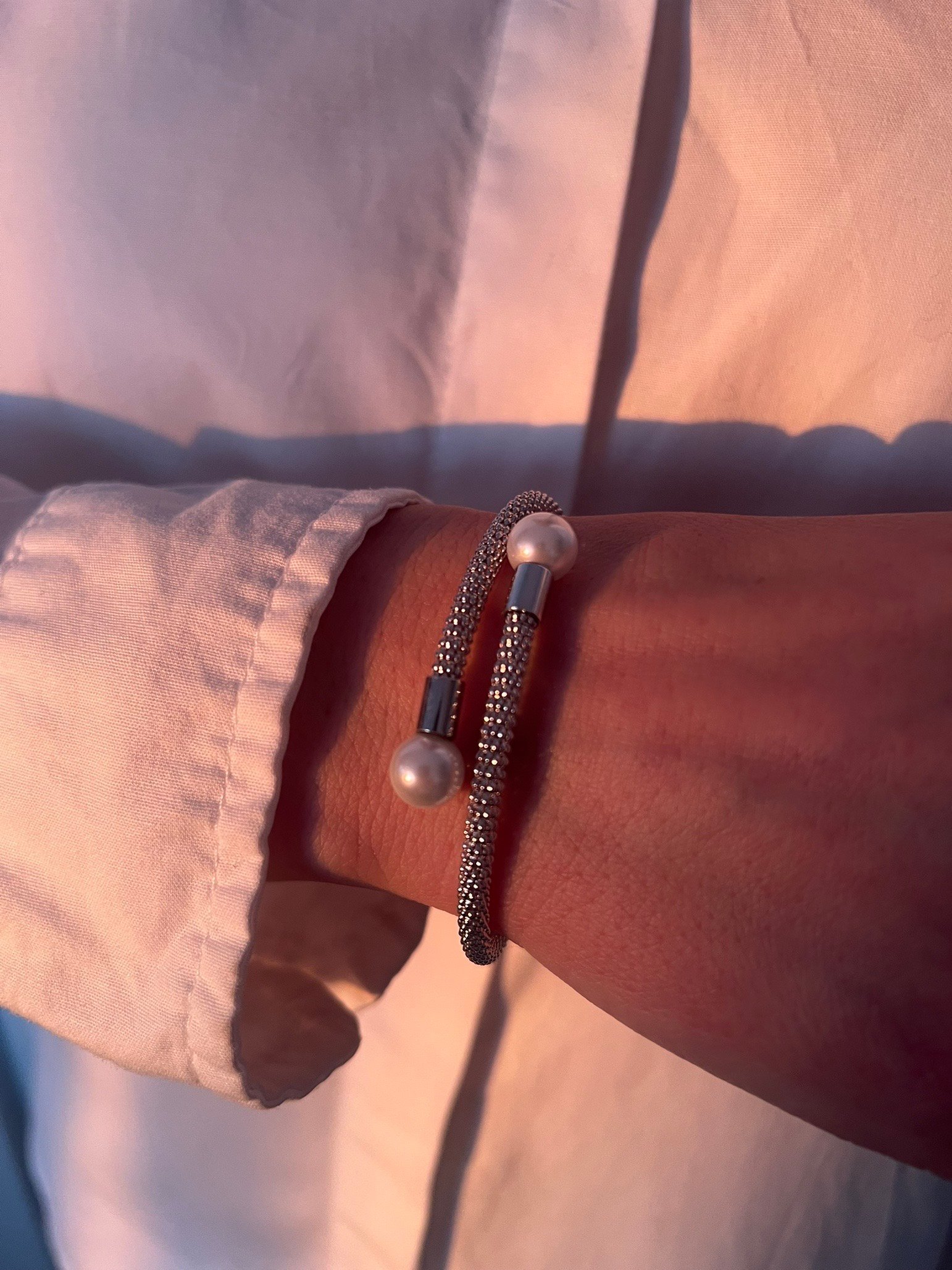 Луксозна гривна Silver Mesh Pearl Bracelet, изработена от сребро проба 925, впечатлява със своята фина плетена структура и елегантни сферични акценти в краищата.