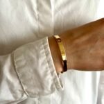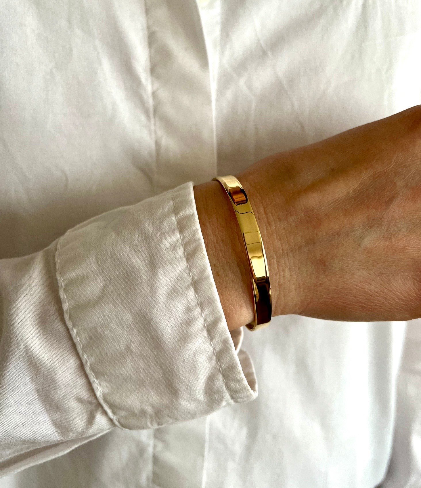 Минималистичният силует подчертава китката с увереност и стил, а гладката повърхност отразява светлината с мек, топъл блясък. Дизайнът е категоричен и модерен – бижу, което говори чрез формата си.
