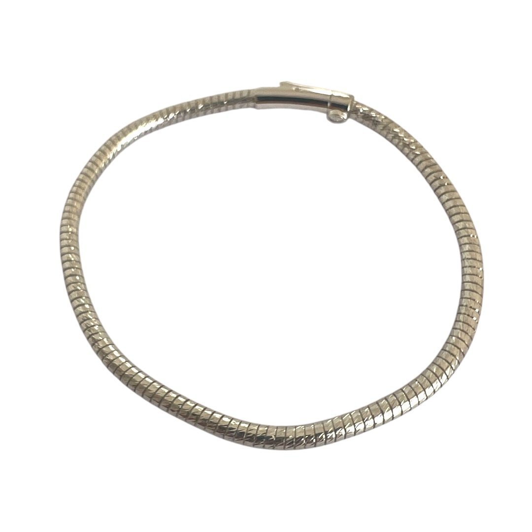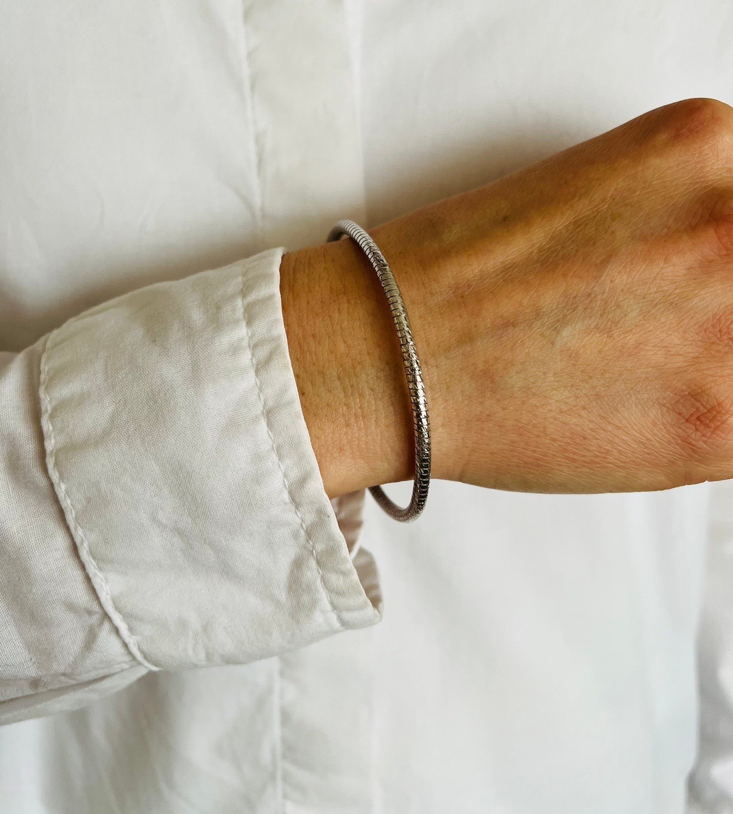 Фино изработената snake текстура създава равномерен метален блясък, който подчертава формата и придава усещане за стабилност и класа. Изчистеният дизайн я прави универсална и лесна за комбиниране както самостоятелно, така и в комбинация с други гривни.