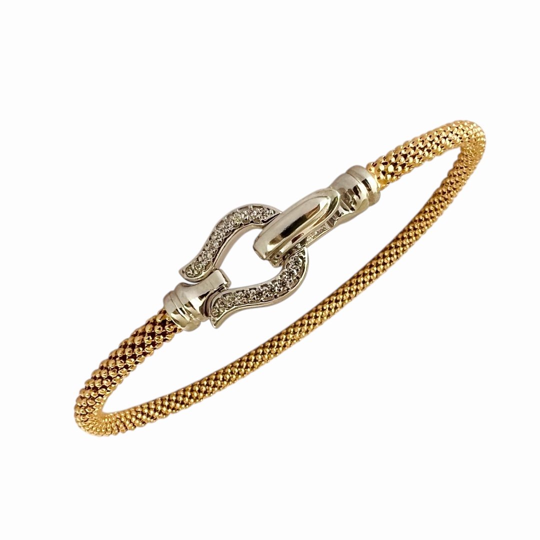 Гривната Regalia Knot, изработена от сребро проба 925 със златисто покритие, е въплъщение на изтънчен италиански лукс и безупречна изработка. Фино изтъканата мрежеста структура обгръща китката с копринена мекота, докато централният елемент – елегантно свързано звено, инкрустирано с блестящи цирконии – придава силен, престижен акцент.