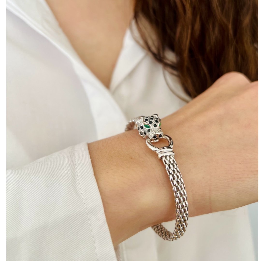 Гривната Panthera Luxe, изработена от сребро проба 925, е истинско въплъщение на сила, характер и безкомпромисен стил. Централният акцент – изящно изработена глава на пантера с фини детайли и наситени зелени акценти в очите – придава на бижуто магнетично присъствие и луксозен завършек.