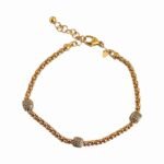 Гривната Golden Trinity, изработена от сребро проба 925 със златно покритие, е въплъщение на изтънчен лукс и балансирана елегантност. Фината двойна верижка обгръща китката с деликатен блясък, а трите сферични акцента с текстурирана повърхност придават дълбочина и изискано сияние.