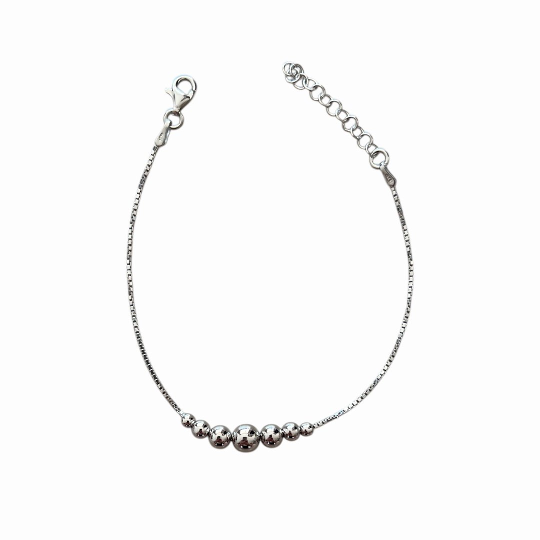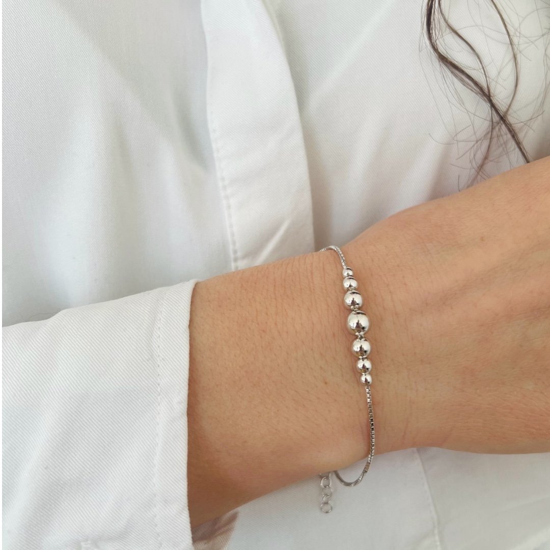 Гривната Silver Harmony, изработена от сребро проба 925, впечатлява със своята балансирана композиция и изчистена естетика. Фината верижка нежно обгръща китката, а централният ред от полирани сферични елементи създава елегантен ритъм и меко огледално сияние.
