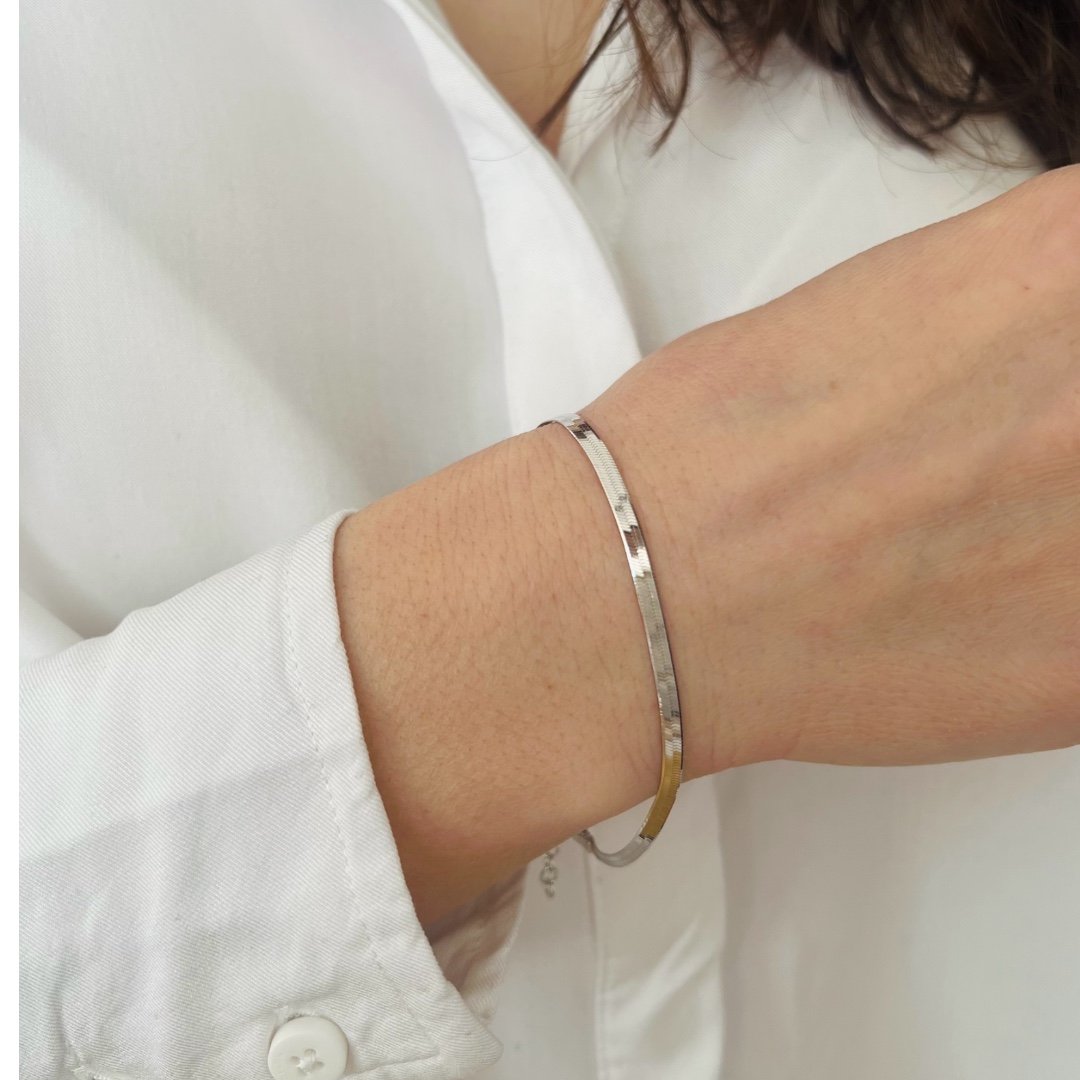 Гривната Milano Classic, изработена от сребро проба 925, е въплъщение на чиста линия и съвършен баланс. Фината плоска плетка тип “snake” приляга елегантно по китката и създава равномерен, копринен блясък при всяко движение.