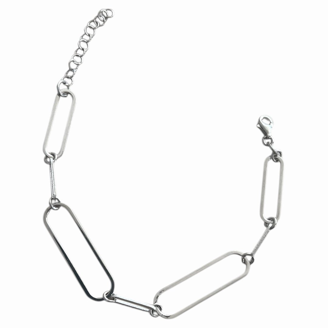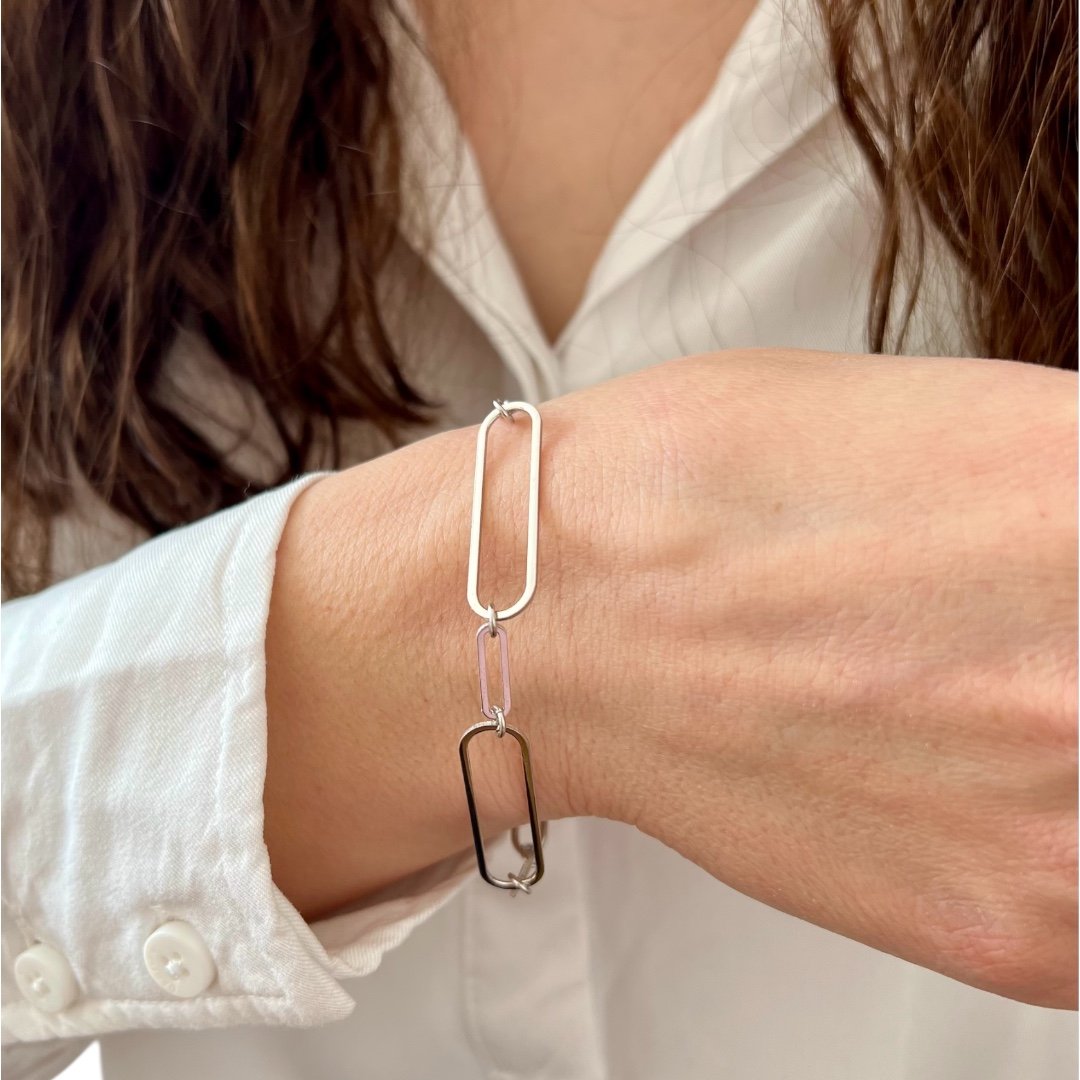 Гривната Urban Line, изработена от сребро проба 925, впечатлява със своя модерен и архитектурен дизайн. Големите издължени звена създават изчистена геометрия и придават съвременно излъчване, което привлича вниманието с дискретна сила.