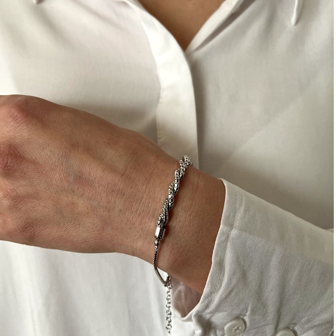 Гривната Diamond Twist, изработена от сребро проба 925, съчетава изтънчен блясък и елегантна динамика в едно впечатляващо бижу. Централният преплетен елемент, фино инкрустиран с блестящи камъни, създава усещане за движение и светлина при всяко движение на китката.