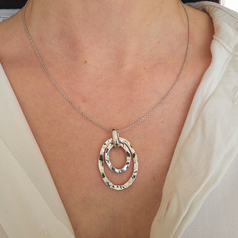 Колието Silver Orbit Pendant е изискан модел от сребро проба 925, съчетаващ модерна геометрия и деликатна артистична текстура. Преплетените овални форми на висулката създават усещане за движение и хармония, придавайки на бижуто елегантно и съвременно излъчване.