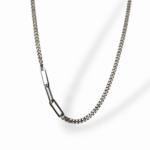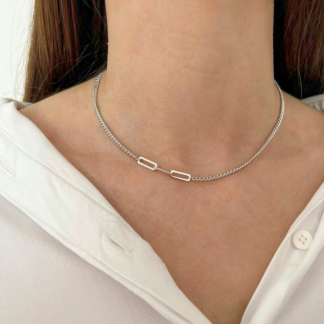 Елегантно колие Silver Fusion, изработено от сребро проба 925, съчетава два различни стила в една балансирана и модерна композиция. Плътната фина верижка плавно преминава в издължени геометрични звена, създавайки динамика и съвременен характер.