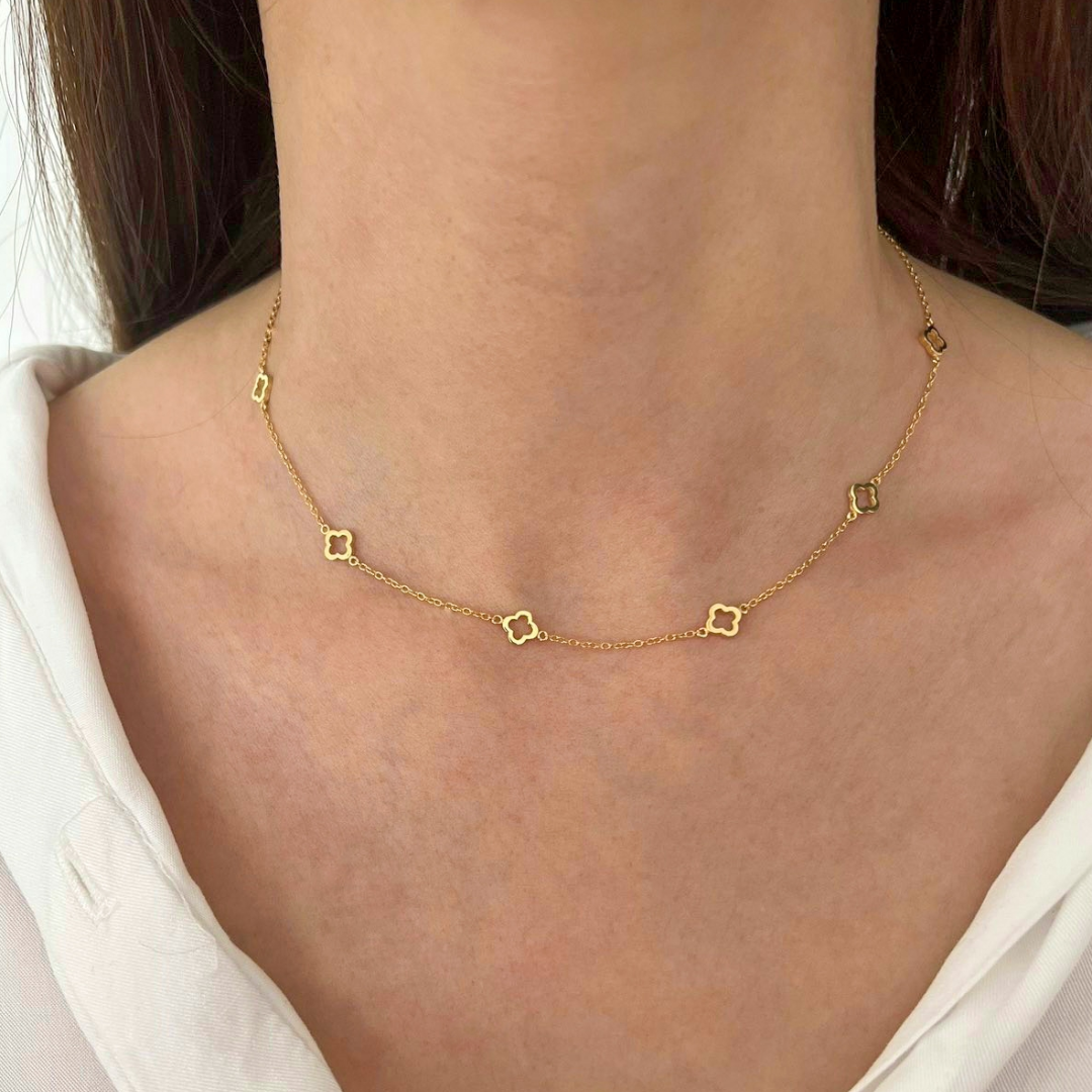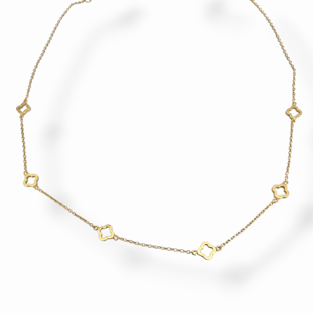Изискано колие Golden Clover Line, изработено от сребро проба 925 със златисто покритие, впечатлява със своя фин силует и деликатно разположени детелини по дължината на веригата. Символът на детелината носи послание за късмет, хармония и положителна енергия.
