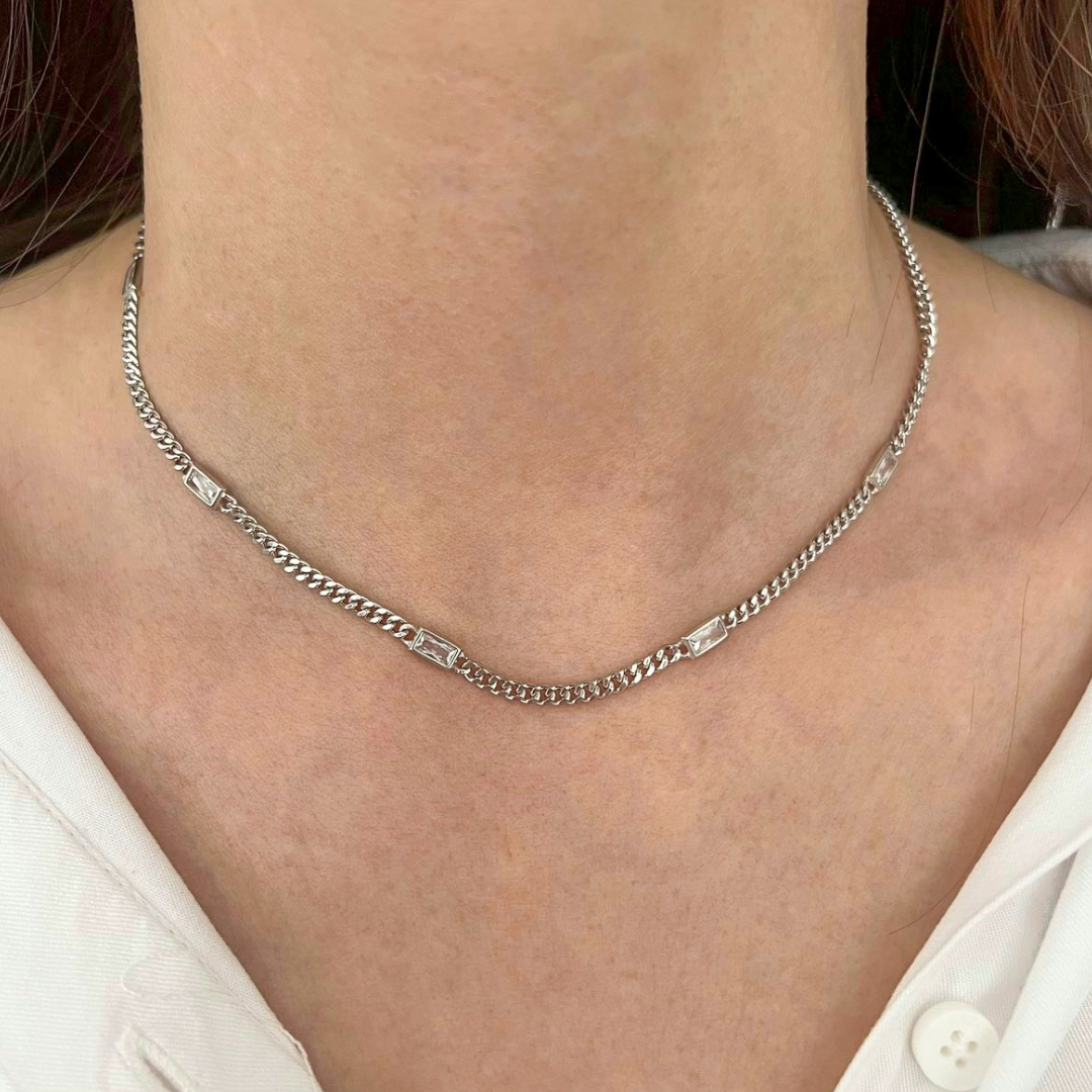 Ефектно колие Urban Prestige, изработено от сребро проба 925, съчетава модерна верижна структура и изчистени геометрични акценти. Правоъгълните елементи са фино инкрустирани с блестящи цирконии, които придават изтънчен блясък и елегантен контраст към масивната верига.