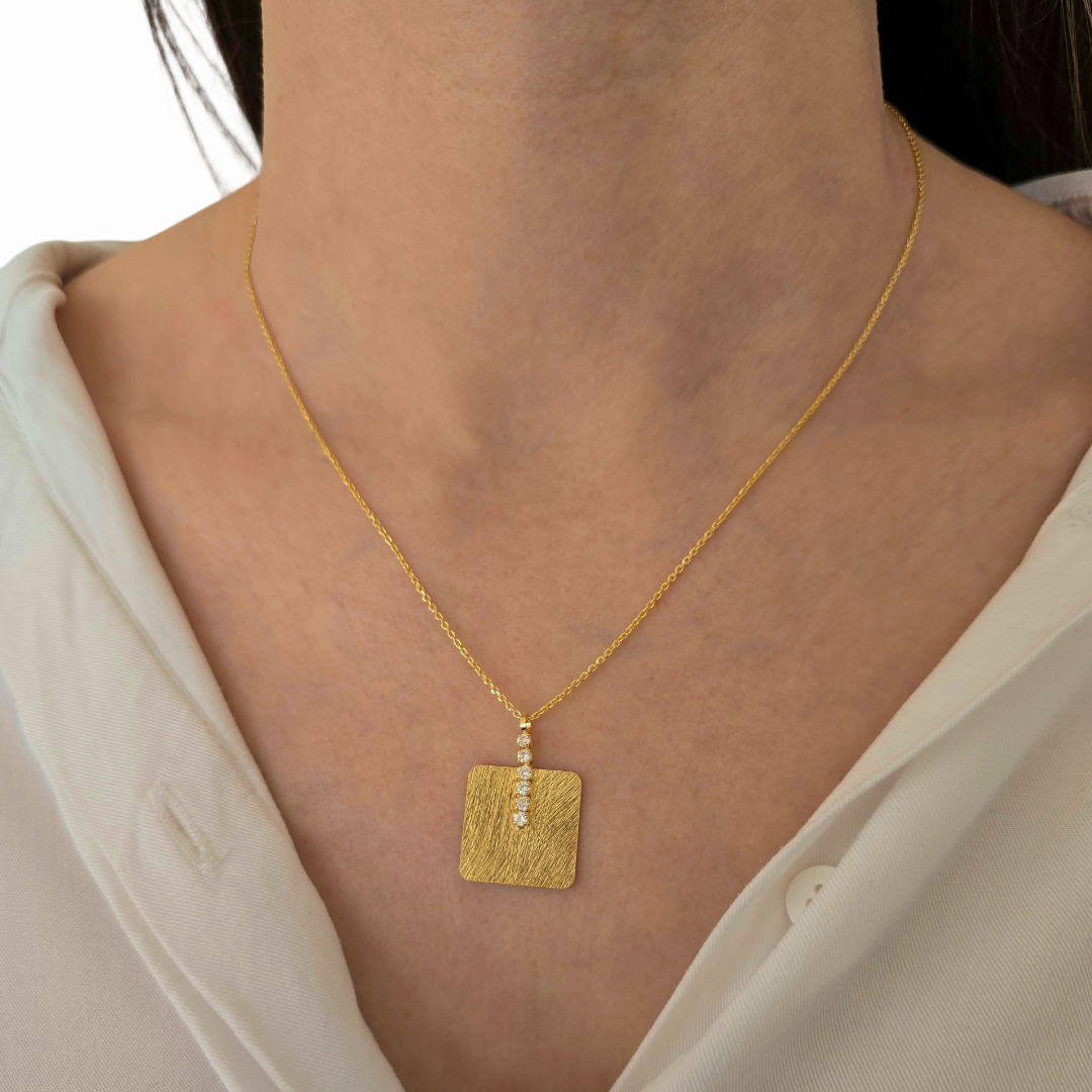 Луксозно колие Golden Frame, изработено от сребро проба 925 със златисто покритие, впечатлява със своята изчистена квадратна форма и артистична текстурирана повърхност. Сатененият релеф създава мек златист отблясък, който придава дълбочина и характер на дизайна.