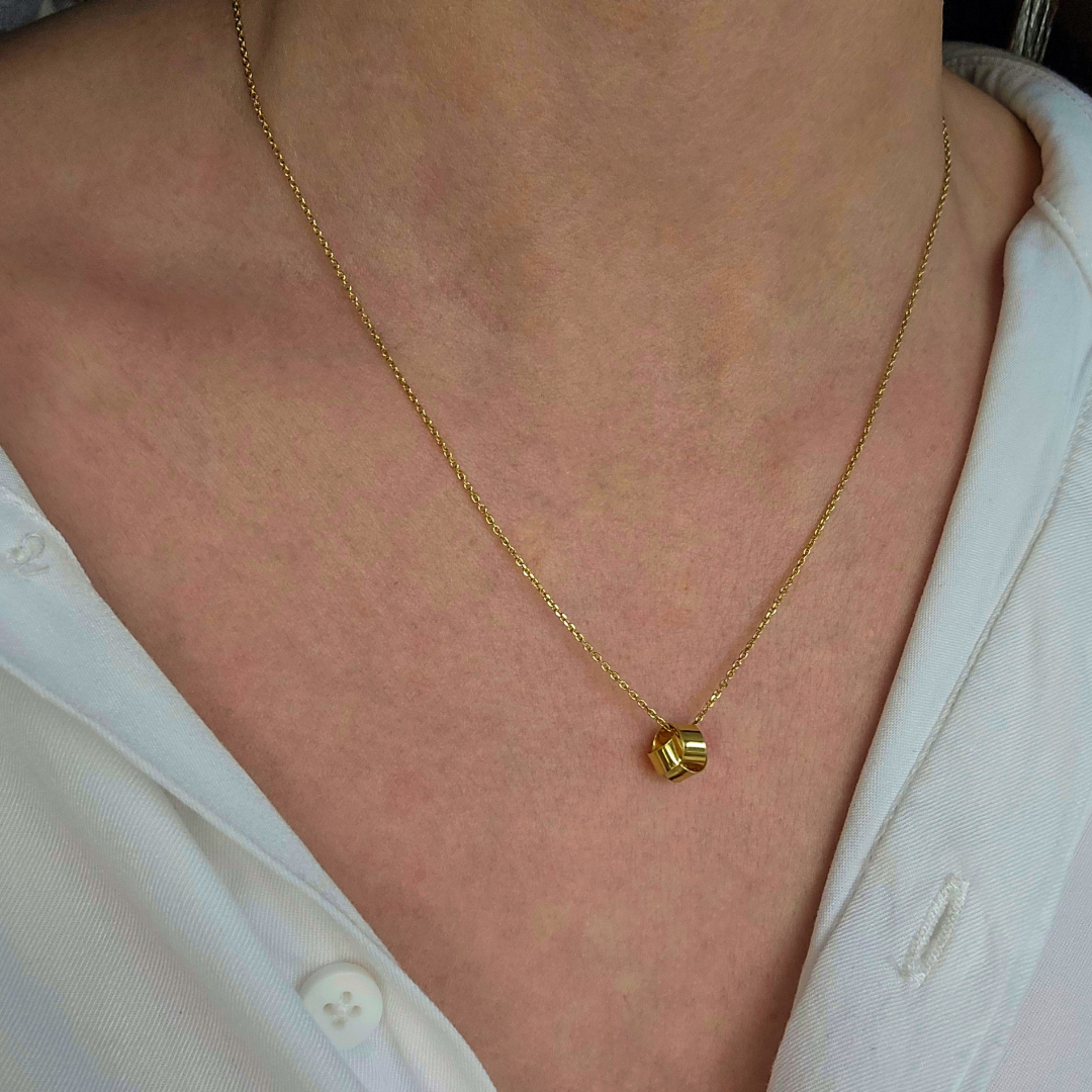 Луксозно колие Golden Gift, изработено от сребро проба 925 със златисто покритие, впечатлява с компактна форма, наподобяваща изискано опакован подарък. Огледалният финиш създава дълбок златист блясък, който улавя светлината и придава усещане за фин лукс.