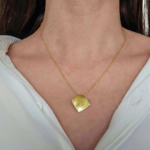 Луксозно колие Golden Tilt, изработено от сребро проба 925 със златисто покритие, впечатлява със своята геометрична квадратна форма, позиционирана под лек ъгъл за по-динамично излъчване. Текстурираната повърхност създава мек сатенен отблясък и усещане за дълбочина.