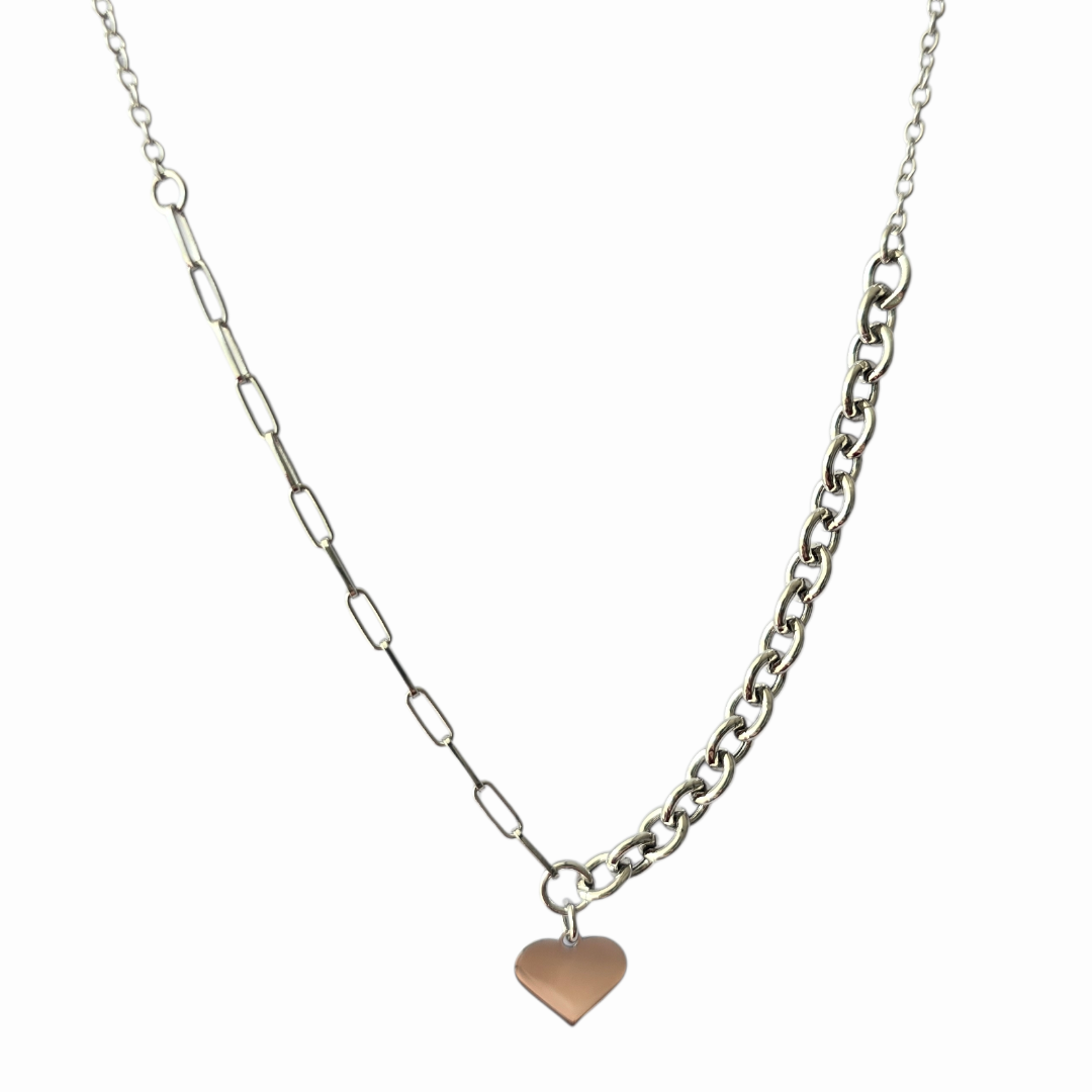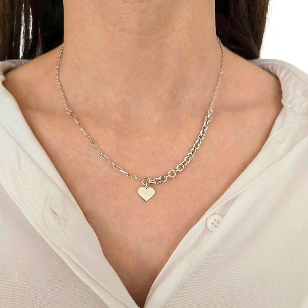 В центъра деликатно сърце добавя романтичен акцент, който балансира модерната визия с нежно послание. Композицията съчетава минимализъм и актуален градски стил, превръщайки бижуто в модерен statement аксесоар.