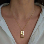 Луксозно колие Golden Square Duo, изработено от сребро проба 925 със златисто покритие, впечатлява със своята композиция от два свързани отворени квадрата. Геометричните форми създават усещане за баланс, структура и модерна елегантност.