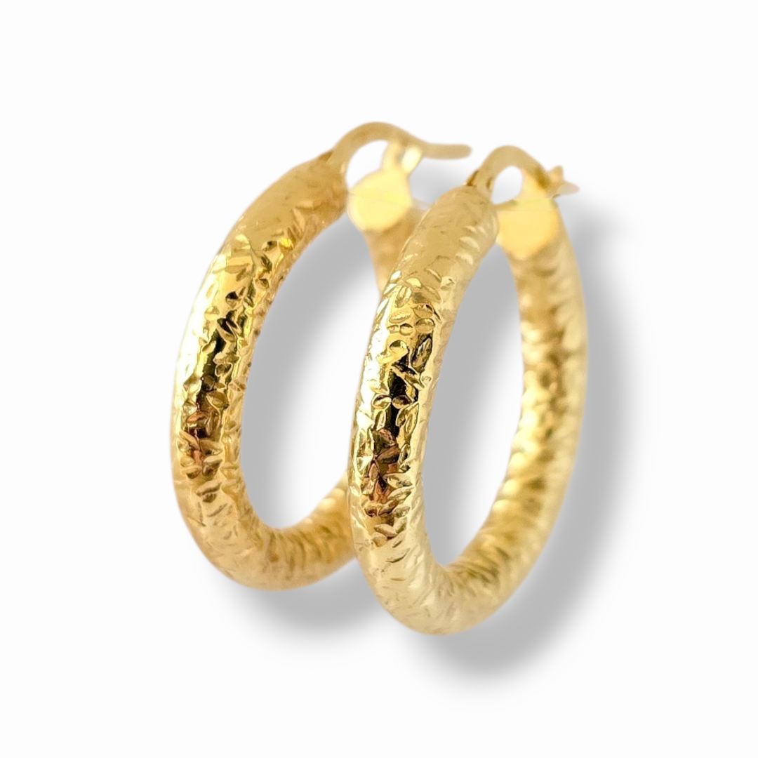 Обеците Golden Facet Hoop са елегантен модел от сребро проба 925 със златисто покритие, отличаващ се с богато фасетирана текстура, която улавя светлината от различни ъгли. Релефната повърхност създава впечатляваща игра на отблясъци и придава на бижуто изразителен, луксозен характер.