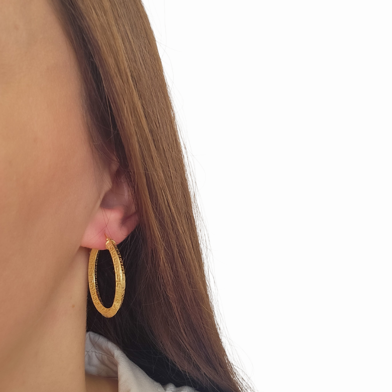 Обеците Golden Greek Hoop са изискан модел от сребро проба 925 със златисто покритие, вдъхновен от класическия гръцки орнамент – символ на хармония, сила и вечна естетика. Фината гравирана линия по външната част придава характер и създава елегантна игра на светлина.