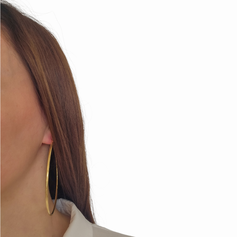 Гладката, полирана повърхност отразява светлината с топъл и благороден блясък, придавайки на бижуто усещане за лукс и увереност. Тънката и лека конструкция позволява обеците да стоят ефектно, без да губят комфорт при носене.