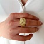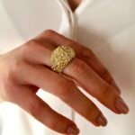 Пръстенът Golden Texture впечатлява със своята обемна форма и нестандартна релефна повърхност, вдъхновена от органични структури. Текстурираният дизайн създава игра на светлина и придава модерен, артистичен характер.