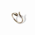 Пръстенът Serpent Elegance впечатлява с фин и изискан дизайн. Главата на змията е украсена с блестящ централен камък, а зеленото око придава характер и отличителен детайл. Тялото е оформено с деликатна текстура, която създава усещане за движение и реализъм.