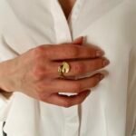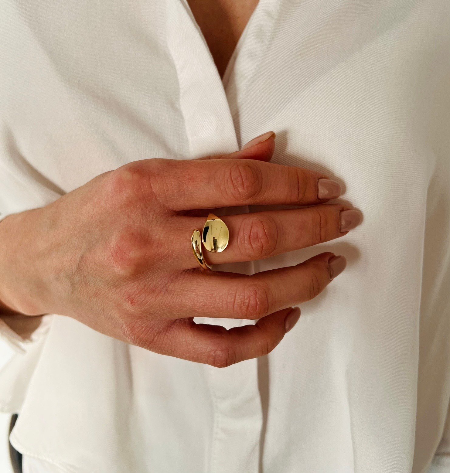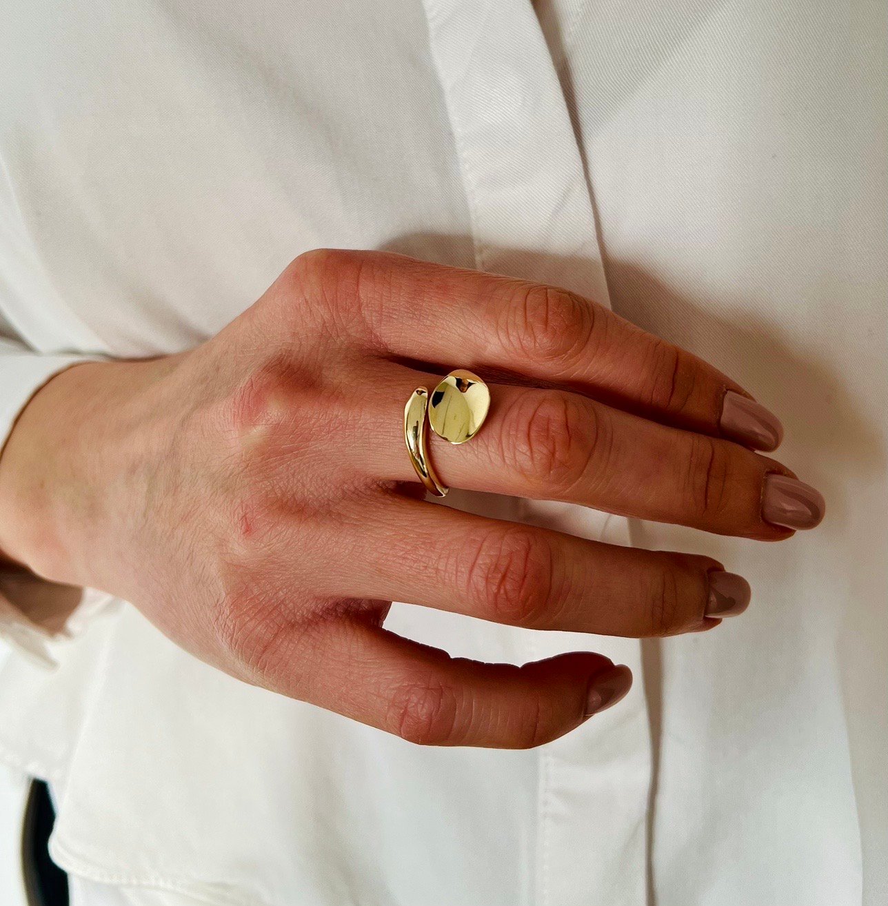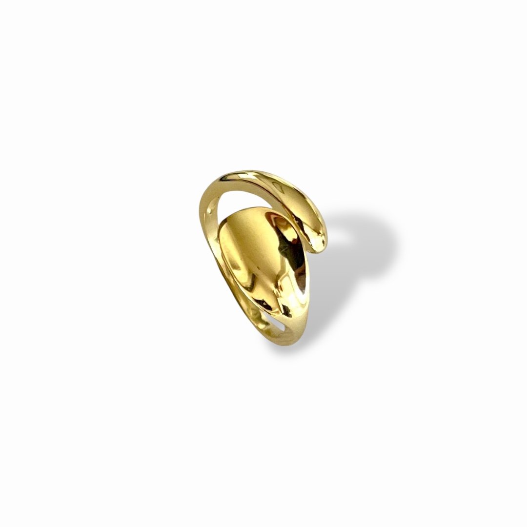 Моделът е изработен от сребро проба 925 със златно покритие, което придава топъл и луксозен финиш. Дизайнът се отличава с плавна, скулптурна форма и силно огледална повърхност, която красиво отразява светлината. Пръстенът е регулируем, което го прави изключително практичен и удобен за носене.